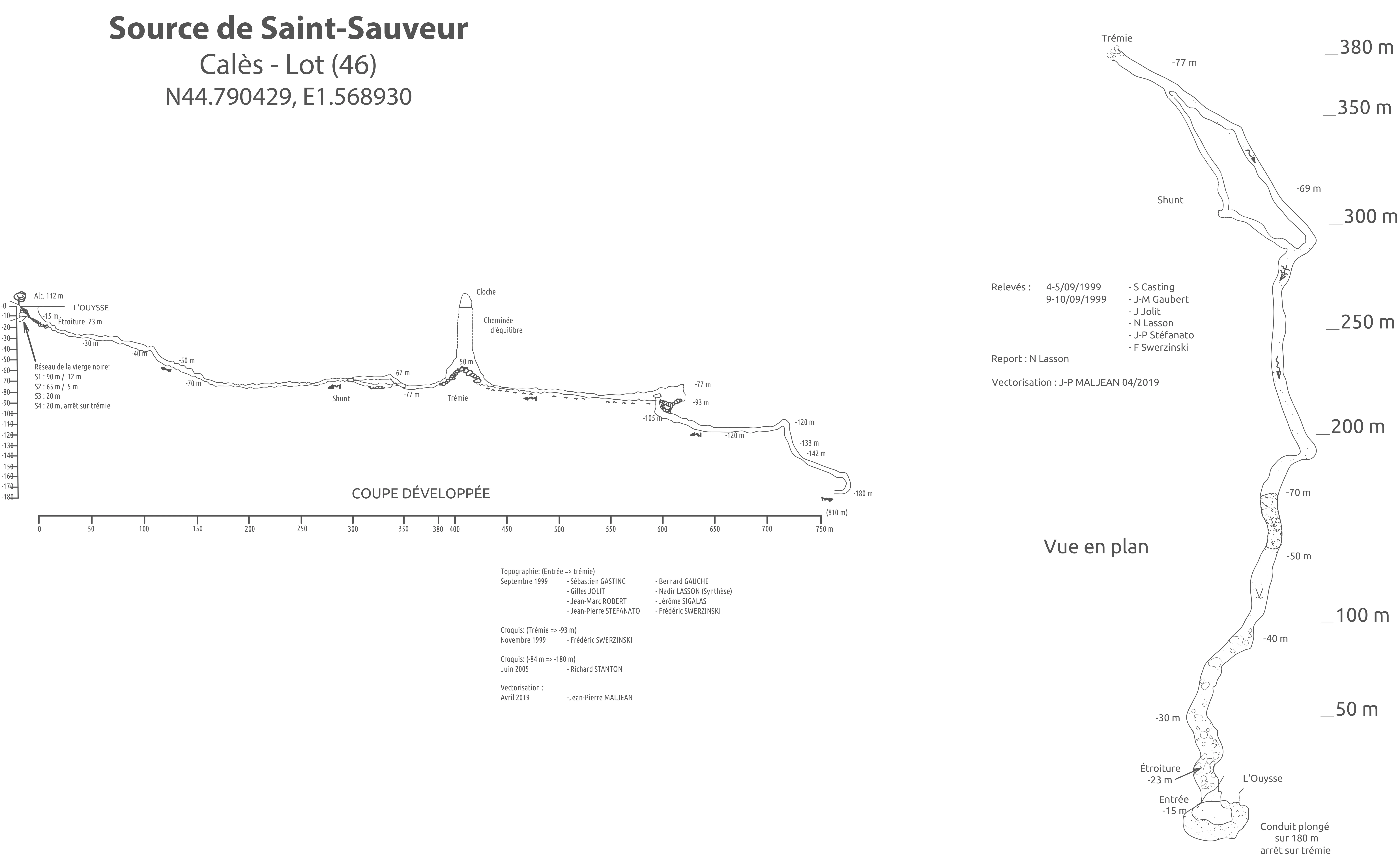 Ce week-end, Ludo, Seb et JP plongeront en recycleur comme à leur habitude, tandis que Joël et moi serons en ouvert, en binôme. Cela fait longtemps que je n’ai pas plongé avec Joël, et ce sera la première fois en souterraine. JP nous a parlé de Saint-Sauveur, je savais déjà que c’était une cavité qui descend très profond, très vite. Ce sera donc un aller-retour assez rapide pour nous, car on atteint les -40 m dans les 100 premiers mètres de progression : autant dire une petite plongée.
